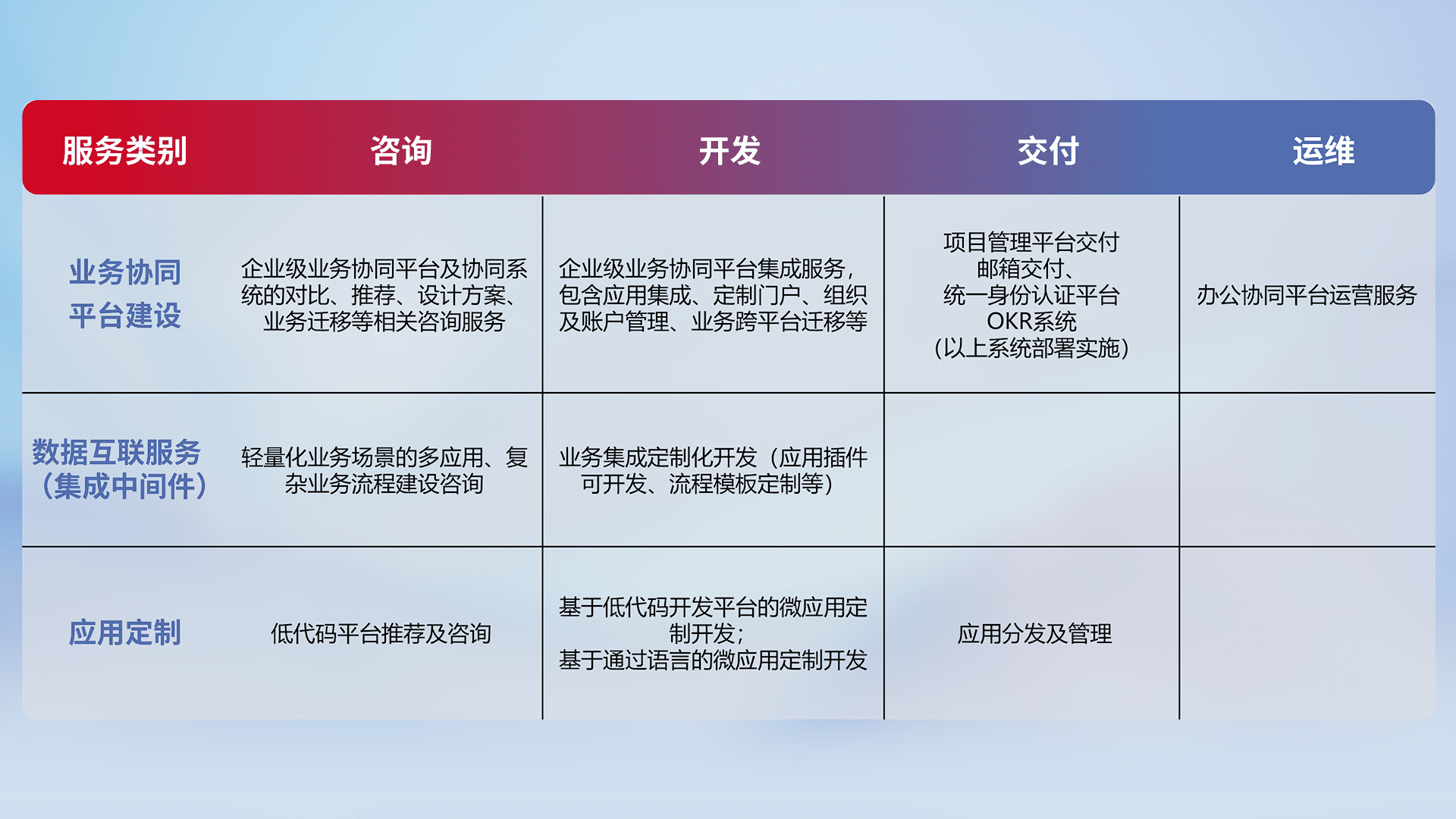 针对钉钉、、企微、、IDaas等平台级产品提供产品的规划、、、方案、、、、交付、、定制化开发等服务,,,实现如统一协同办公、、、、智能客户服务、、、混合会议管理、、智能数据查询、、等业务场景,,,实现数字化转型。。。。